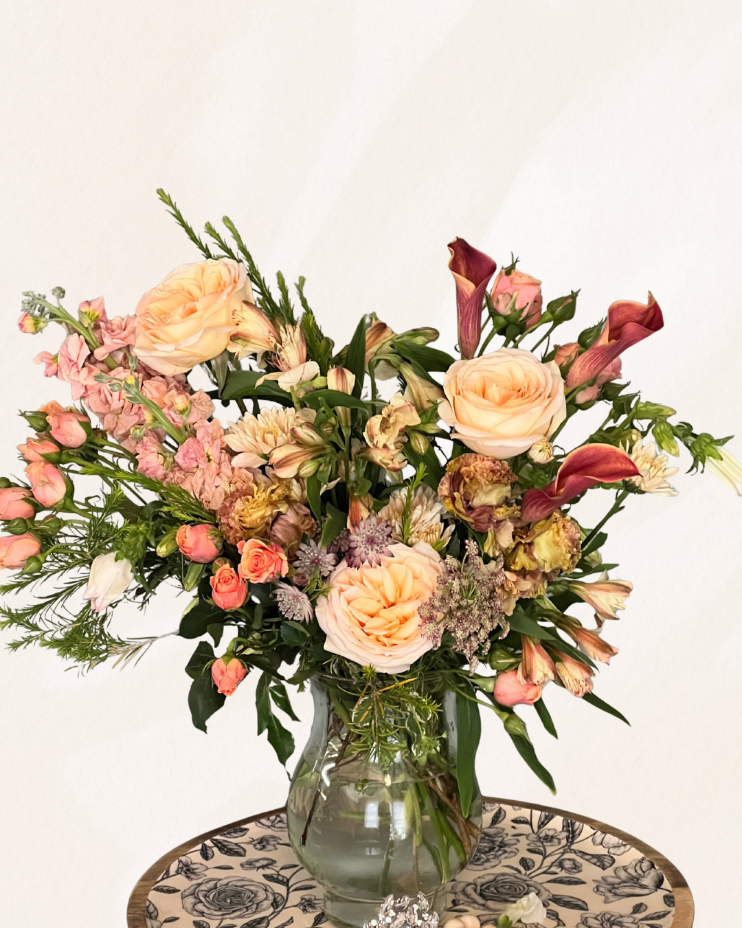 Warm tones of soft peach, rust, and blush blend together in this garden-inspired design. Featuring roses, calla lilies, and textural accents, it captures the magic of golden hour in bloom. Perfect For: Sympathy, Fall Celebrations, Retirement, Get Well